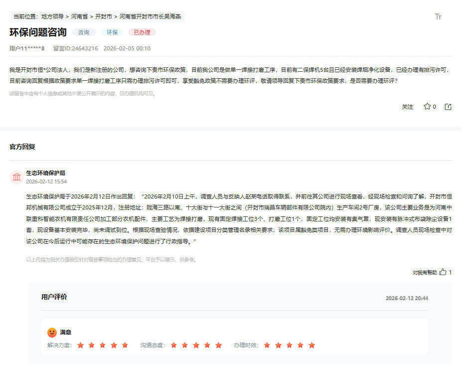 “企业已办理排污许可,咨询得知按政策可享受环评豁免,可心里还是没底,希望相关部门回复下政策要求,是否需要办理?”留言背后,道出了经营主体对政策可预期、服务可落地的真切期盼。
