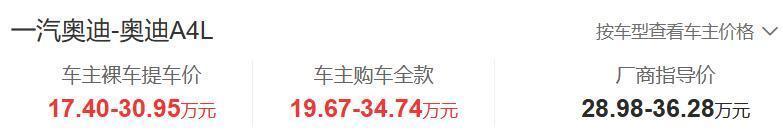 除了奥迪A4L外,找不出别的车型了。该车售价28.98-36.28万元,车主提车价为17.40-30.95万元,标配车型的价格优惠了11.58万元,入门价格早已跌至18万以内,车主在买车时可能会面临“鸡头凤尾”的选择:差不多的价格,既能买到低配奥迪A4L,又能买到高配帕萨特/迈腾,应该怎么选?